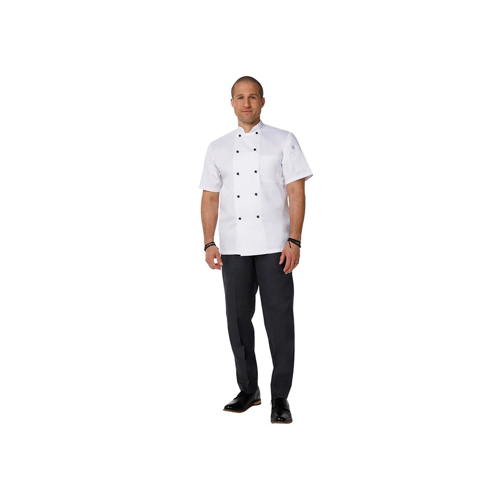 Elevate your kitchen team's look with the Macquarie White Short-Sleeved Chef Jacket in 2XL from Chef Works. Expertly tailored from a premium poly/cotton blend, this jacket balances breathability and durability, ensuring a crisp, professional appearance from service start to finish. The short sleeves offer unrestricted movement and superior airflow, making it ideal for bustling restaurants and catering events alike. Practical features include a top-stitched left chest pocket for pens and thermometers, plus back vents that promote ventilation during high-tempo shifts. Machine-washable, the Macquarie Jacket resists fading and maintains its bright white hue wash after wash.