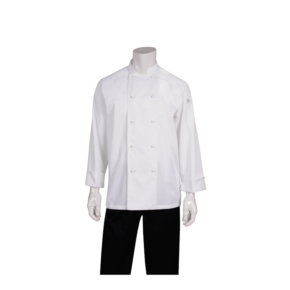 This double-breasted chef jacket is available in black or white. Made from a polyester cotton blend with long sleeves and turned back cuffs, they're an ideal choice for food service businesses.