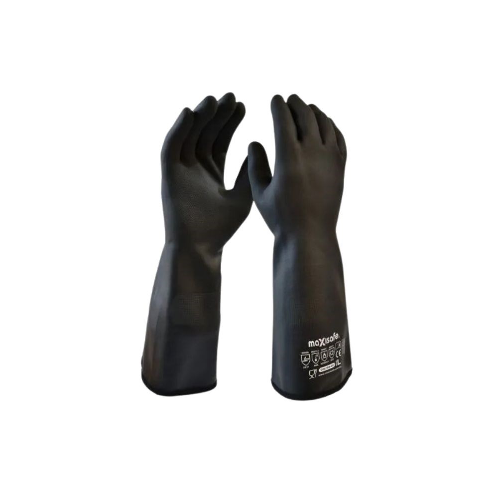The embossed diamond grip enhances performance in wet conditions, while the bonded liner technology keeps hands drier and facilitates easier donning. Resistant to acids, caustics, solvents, oils, and chemicals such as methanol and sodium hydroxide, this glove is a versatile choice for workers in chemical industries, hot hose handling, janitorial tasks, laboratory environments, and more. Sold in cartons of 48 pairs, the Glove Neoprene Heat Resistant 360mm Large Black Size 10 Maxisafe offers robust protection across various sectors, including petrochemical and refining, galvanising, and degreasing.